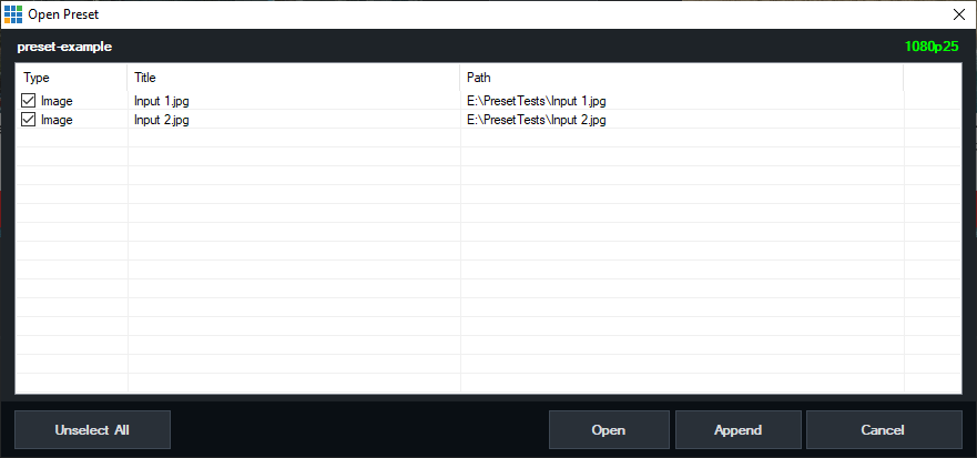 Click Append to add the inputs in this Preset to the existing session.