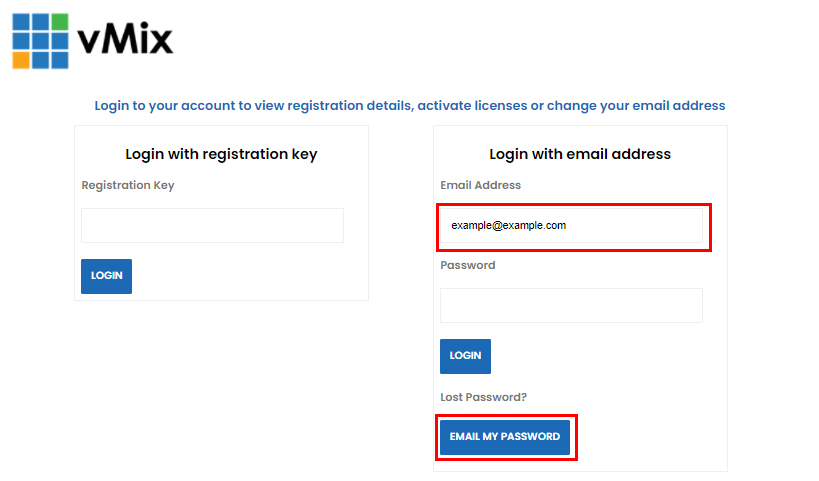2. Or with your email address and password. This will always be the email address that the key is currently registered to under your vMix Account. This email can also be changed via your vMix Account at any time.